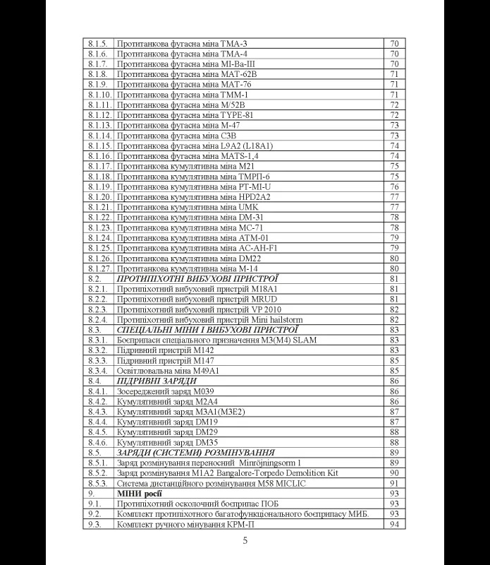 У довіднику систематизовано вимоги безпеки під час розмінування, розкопування, транспортування та знищення ВНП, визначено обов’язки посадових осіб інженерних підрозділів, наведено перелік і характеристики оснащення, екіпірування та засобів пошуку, маркування й підриву. Значну увагу приділено класифікації, маркуванню та тактико-технічним характеристикам авіаційних боєприпасів, протипіхотних і протитанкових мін, вибухових пристроїв дистанційного мінування, інженерних боєприпасів країн-партнерів, а також зразків мін і вибухових засобів, що застосовуються російською федерацією.