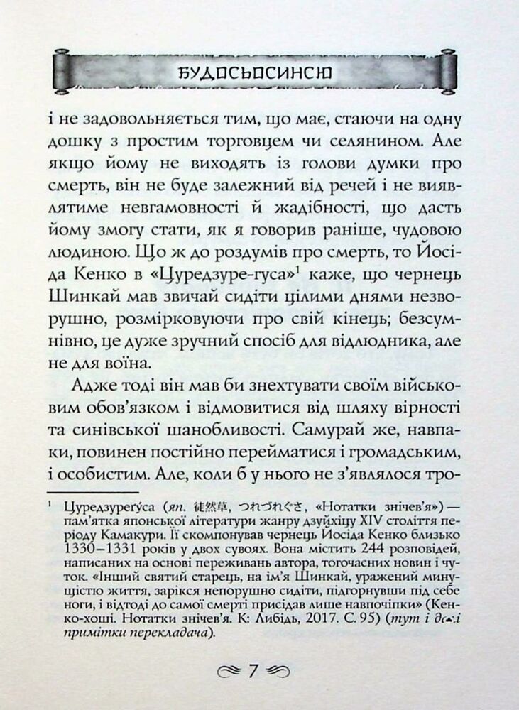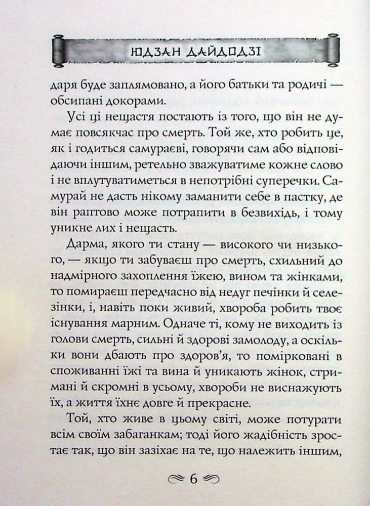 До цієї книги ввійшли філософські трактати двох великих мислителів, присвячених бусидо — Шляху воїна. Так у стародавній Японії називали зведення правил і настанов, що визначали поведінку та повсякденне життя самураїв. Класичне розуміння цього морального кодексу честі викладено в повчаннях «Будосьосинсю» («Напутнє слово тому, хто стає на Шлях воїна») спадкового самурая та державного діяча Юдзана Дайдодзі (1639–1730).