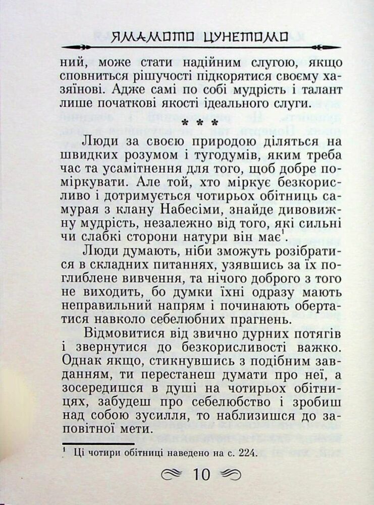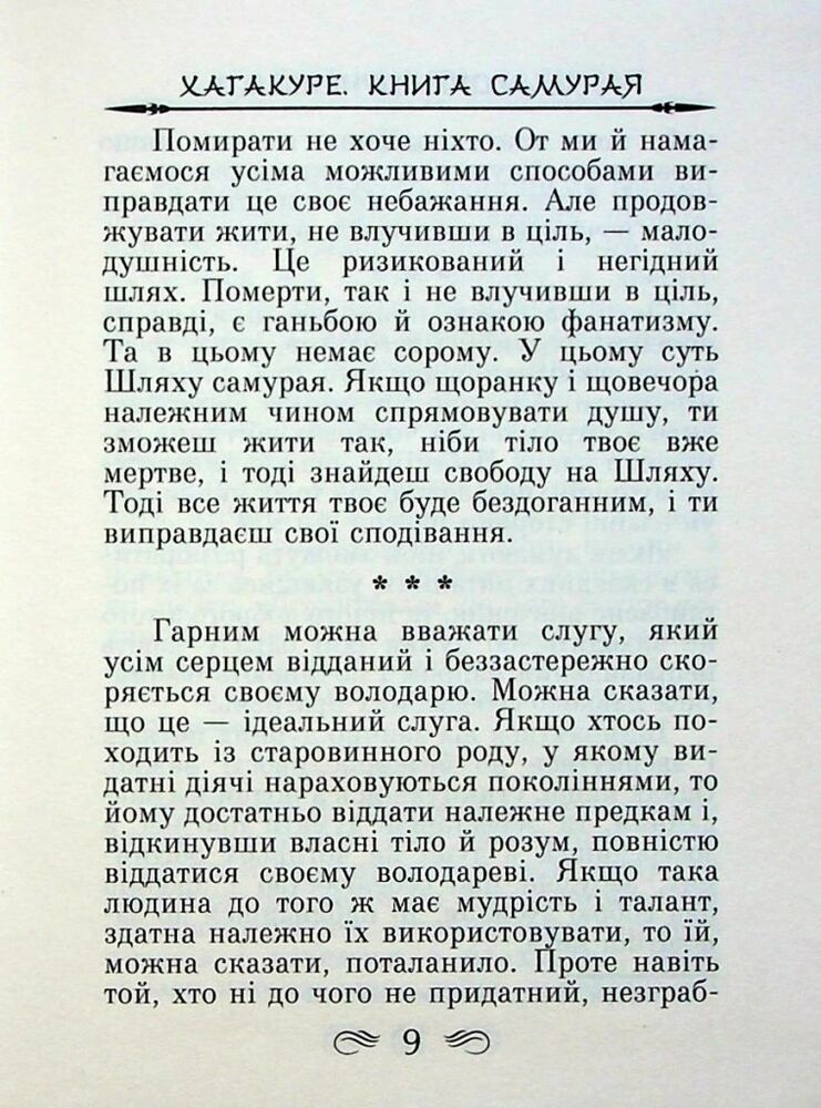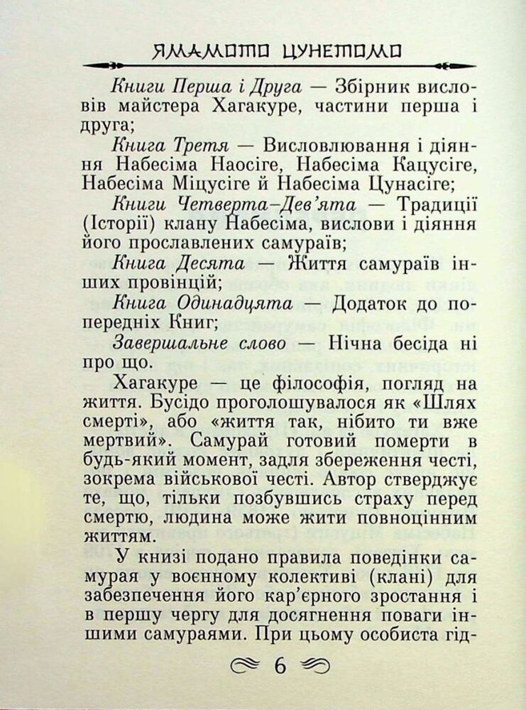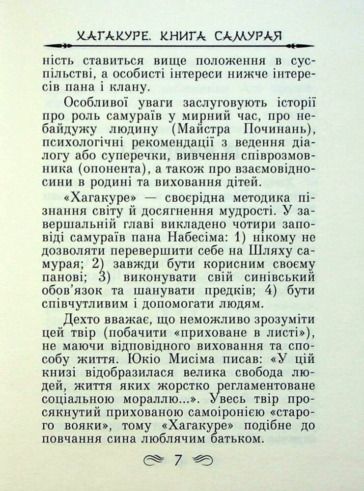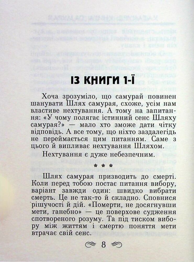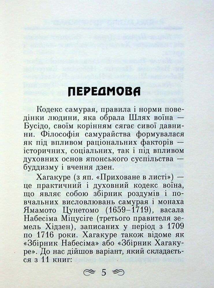 Книга знайомить із найвідомішими японськими філософськими трактатами Ямамото Цунетомо «Хагакуре» та Міямото Мусасі «Книга П’яти Кілець».