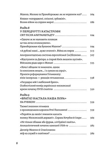 Від дипломатії й політичних інтриг до Північної війни та внутрішніх конфліктів. Історик Віктор Горобець у своїй книжці аналізує еволюцію гетьманської влади й стосунки зі старшиною, відносини із Запорозькою Січчю, зовнішньополітичні контакти та драматичні події останніх років Мазепиної доби — аж до переходу на бік шведів і власне полтавської катастрофи. Автор розбирає мотиви й історичні обставини, що впливали на рішення гетьмана, малюючи його відвертий портрет на тлі епохи.