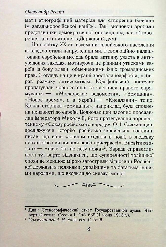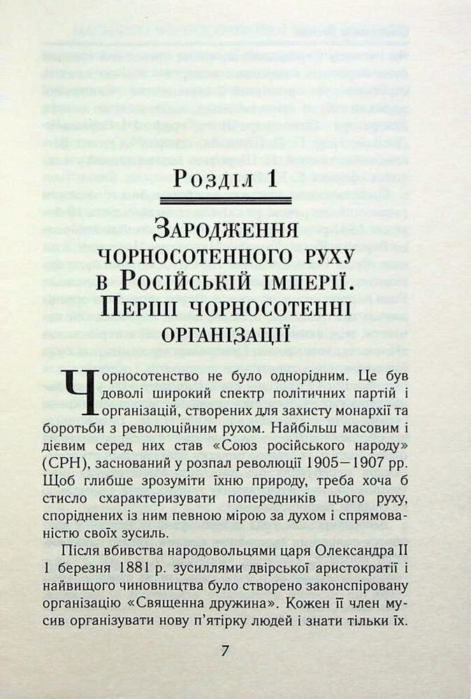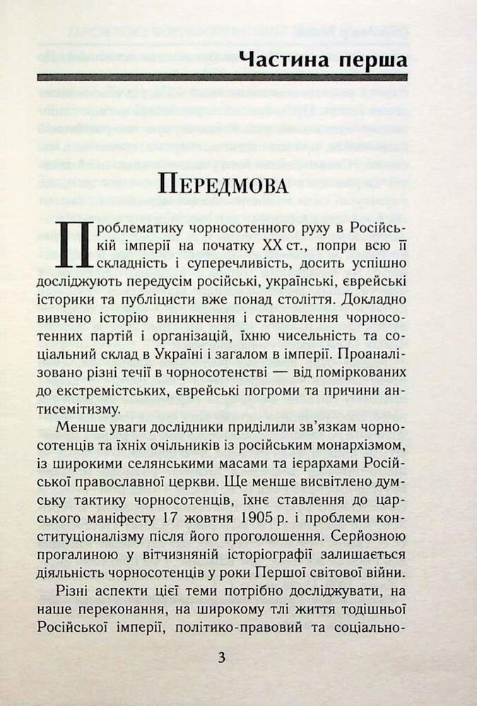 У першій частині книги досліджено історію зародження, становлення і функціонування чорносотенного руху на теренах України на тлі суспільно-політичної ситуації в тогочасній імперії на початку ХХ ст. загалом та в період Першої світової війни зокрема.