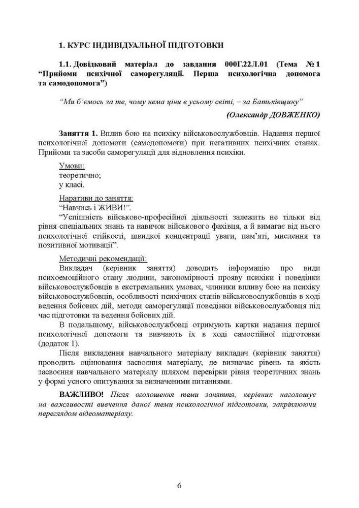 Курс містить необхідний довідковий матеріал з психологічної підготовки (індивідуальна підготовка вчинення дій в складі підрозділу) за програмою базової загальновійськової підготовки (для підготовки мобілізаційних ресурсів, версія 5, термін навчання 1,5 місяці).
