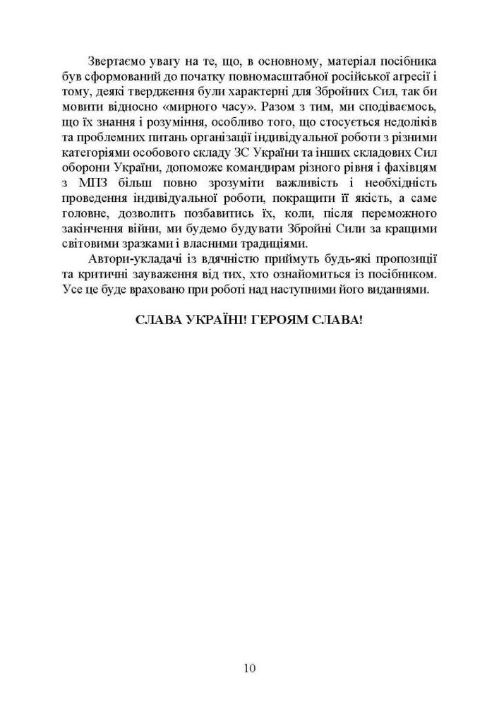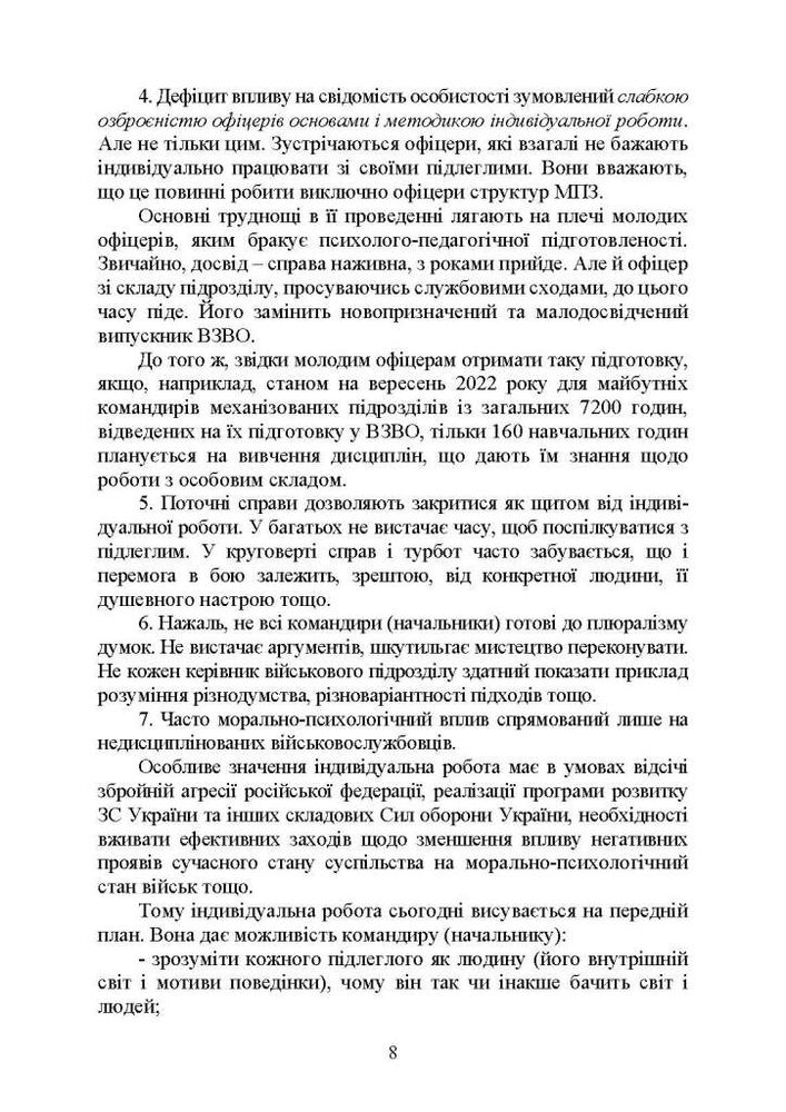 Матеріали посібника допоможуть військовослужбовцям ЗС України та інших складових Сил оборони України отримати ґрунтовні знання з організації індивідуальної роботи з різними категоріями особового складу. Крім того, вони отримають знання з досвіду практичної організації і проведення індивідуальної роботи з підлеглими, а саме: основних напрямів, принципів, форм та методів її проведення з особовим складом.