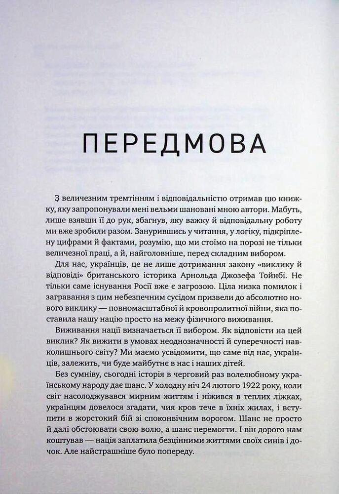 Автори цієї книжки добре відомі читачеві. Академік Володимир Горбулін у своїй роботі «Як перемогти pосiю у війні майбутнього» (2020) передбачив війну дронів і роботів та апелював до «асиметричної війни» із застосуванням москітних стратегій — саме це дало змогу Україні вистояти й не припинити рух до перемоги в найважчий час війни. Валентин Бадрак у своїй «Східній стратегії» (2011) позначив готовність моckви до великої війни проти України й відпрацювання сценаріїв нападу. Об’єднавшись, автори зберегли свою відвертість.