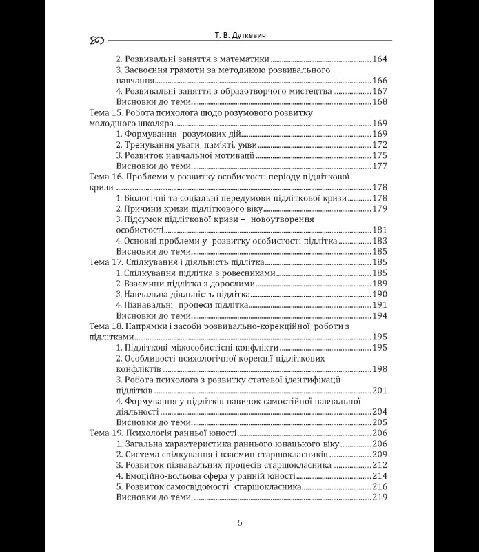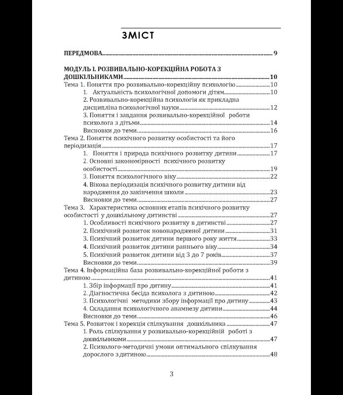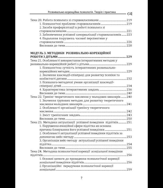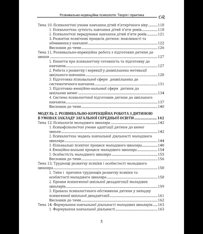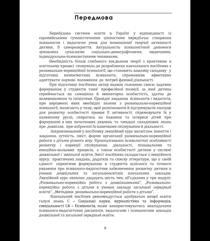 Проаналізовано психологічні особливості розвитку і корекції спілкування, діяльності, пізнавальних й емоційно-вольових процесів, а також особистості дитини у системі дошкільної та шкільної освіти. Зміст посібника складається з текстів лекцій, практичних завдань, додатків та списку літератури.