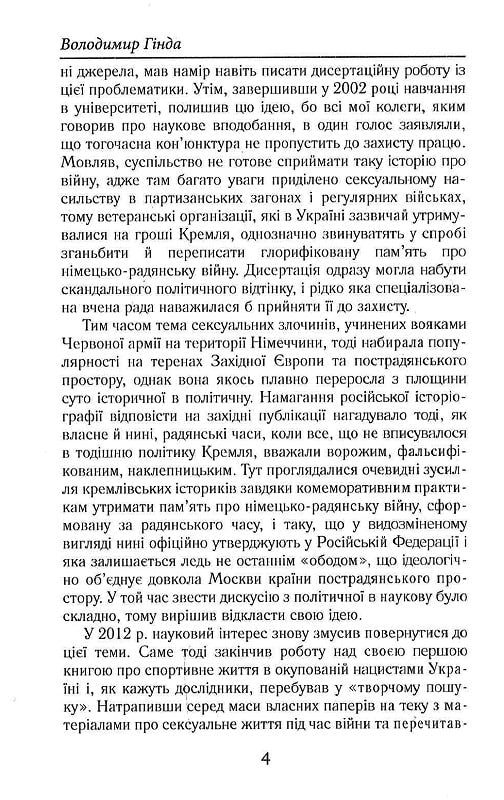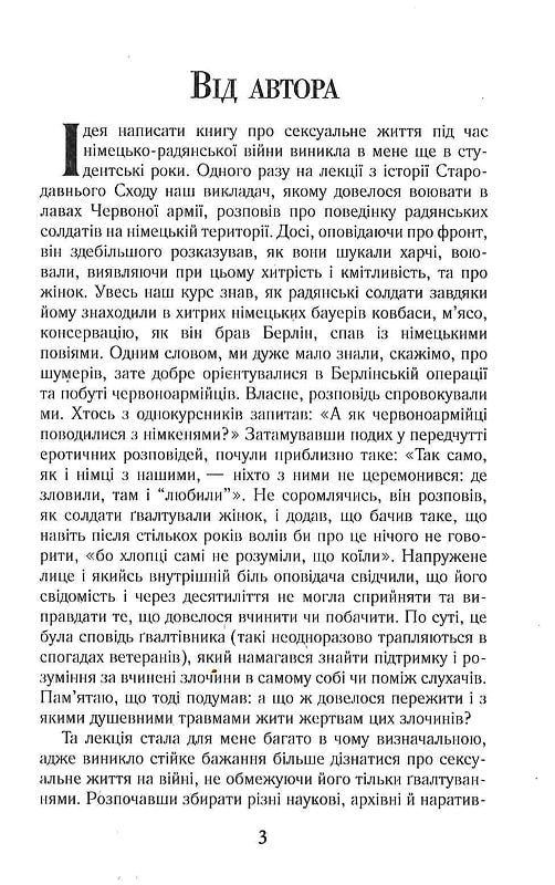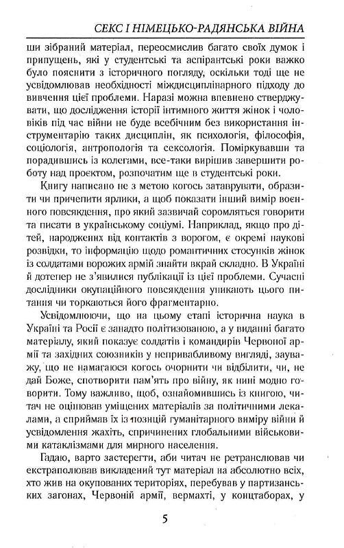 У книзі на основі архівних документів, воєнних мемуарів, спогадів та аналізу досліджень зарубіжних істориків порушено тему інтиму під час німецькорадянської війни, раніше замовчувану, сороміцьку, майже не досліджувану в українській історіографії. Сексуальне життя в екстремальних умовах донині не прийнято обговорювати як самодостатню проблему, адже секс на фронті якось не дуже співвідноситься з такими категоріями, як самопожертва, героїзм чи вірність. Але автор, відступивши від усталених дослідницьких канонів, спробував максимально повно розкрити цю маловідому сторінку історії.