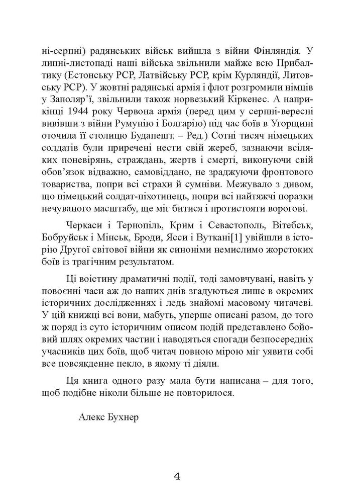 Відомий німецький історик Алекс Бухнер простежує перебіг головних оборонних битв військ вермахту в 1944 році. Черкаси і Тернопіль, Крим і Севастополь, Вітебськ, Бобруйськ і Мінськ, Броди, Ясси і Вуткані ввійшли в історію Другої світової війни як синоніми неймовірно жорстоких боїв із трагічним результатом.