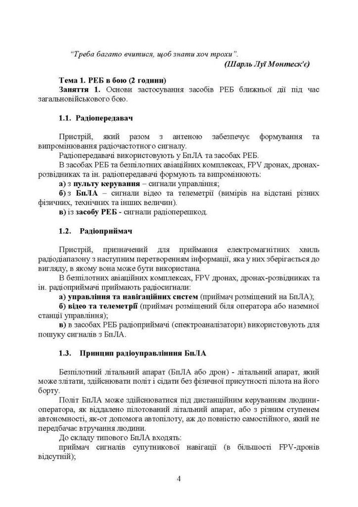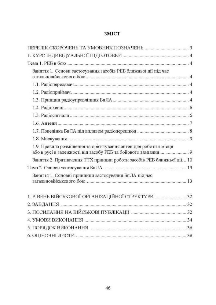 Зокрема в курсі висвітлено необхідні знання щодо основ застосування засобів РЕБ ближньої дії під час загальновійськового бою. Розглянуто основні принципи застосування БпЛА під час загальновійськового бою.