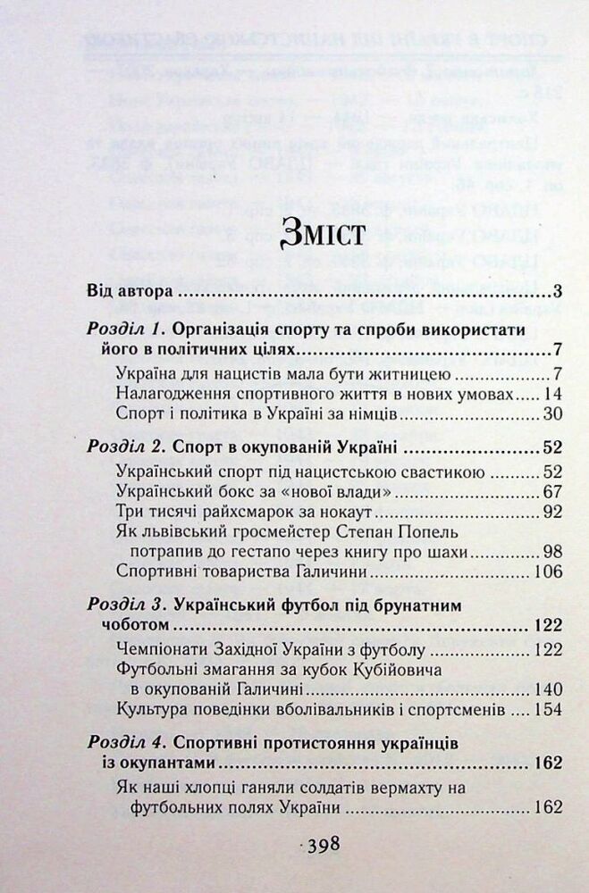 У пропонованій книзі відображено маловідомі сторінки спортивного життя на території окупованої нацистами України під час німецько-радянської війни. Автор показує, у яких умовах воно відбувалося; хто його організовував; як ставилися до спорту німецька (румунська) окупаційна адміністрація та українські спортсмени; які причини спонукали українців займатися спортом на окупованій території, брати участь у боксерських, футбольних, хокейних змаганнях, адже, за радянською інтерпретацією, вони були ворогами народу і в такий спосіб активно співпрацювали з гітлерівцями; яку роль спорт відігравав у житті солдатів вермахту та українського населення.