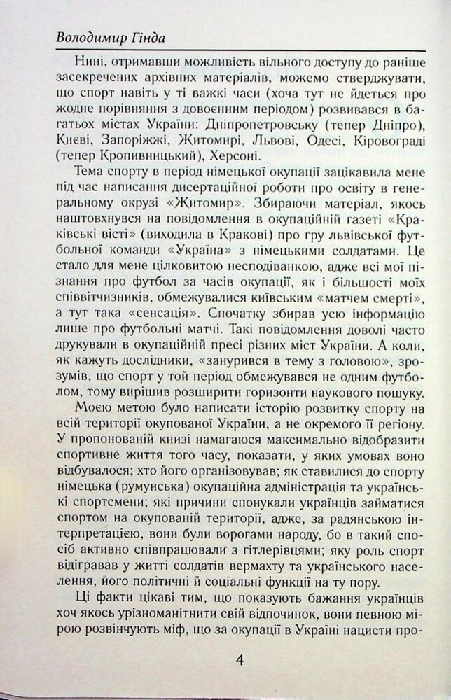 Книга ґрунтується на матеріалах окупаційної преси України, у якій досить змістовно віддзеркалено спортивне життя того періоду, а також на мемуарах, спогадах учасників тих подій.