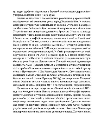 Історик Григорій Рій розповідає про спроби оунівців представити Україну на міжнародній арені, розкриваючи деталі окремих операцій. На основі розсекречених архівів ЦРУ, британської розвідки та ГДА СБУ зокрема автор відтворює історію міжнародної діяльності ОУН у роки Холодної війни. У хронологічній послідовності викладено епізоди співпраці з розвідками США та низки європейських країн, а також описано участь діячів ОУН у світових антикомуністичних мережах.