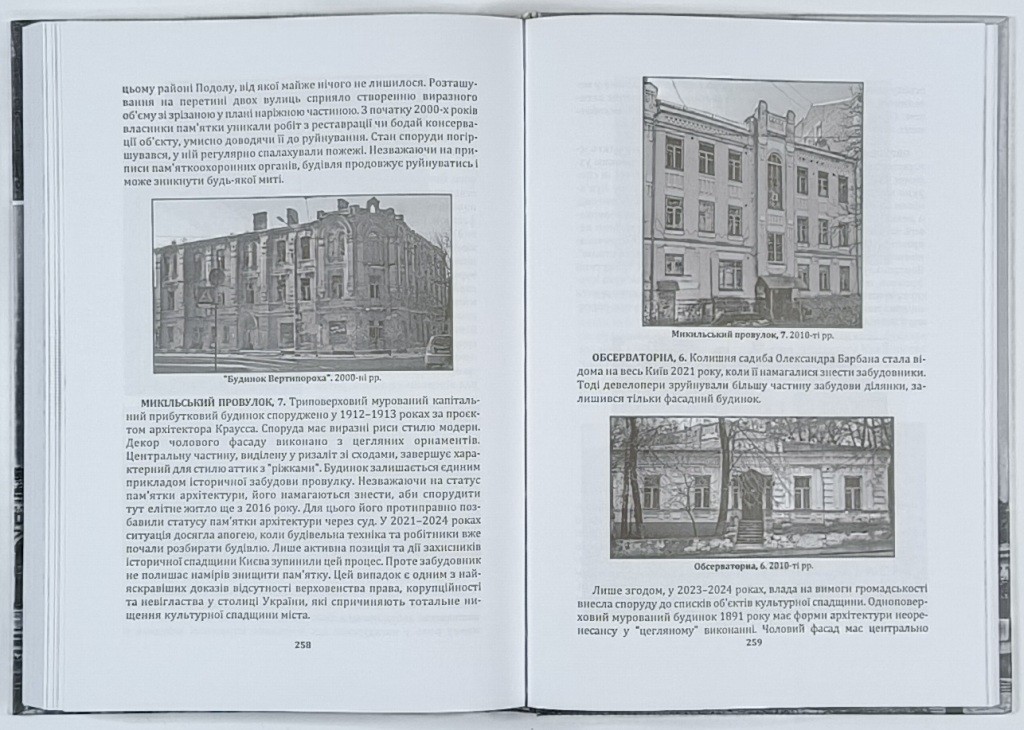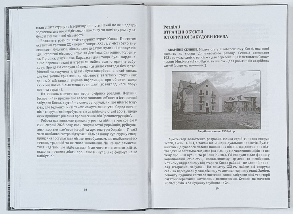 Автор зібрав матеріал про втрачені споруди, які мали визначні архітектурні форми і грали важливу роль у формуванні історичної забудови вулиць, площ і провулків міста. Водночас, у книзі можна дізнатися про те як виглядала забудова тих районів Києва, які були кардинально реконструйовані у ХХ–ХХІ сторіччях.