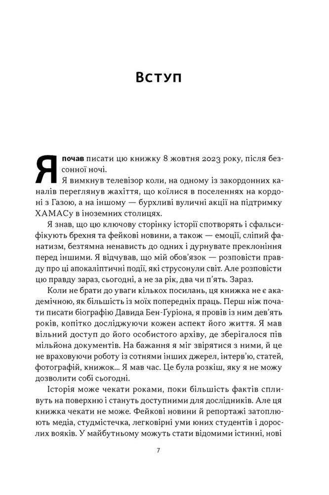 7 жовтня 2023 року стало однією з найтрагічніших дат в історії Ізраїлю. Варварський напад ХАМАСу на прикордонні поселення та мирну рейв-вечірку приніс масові вбивства, руйнування та захоплення заручників. Світ побачив жахливі кадри злочинів терористів і в той самий час — хвилі підтримки ХАМАСу в іноземних столицях. Уже 8 жовтня письменник та історик Міхаель Бар-Зохар почав писати цю книжку, щоб зафіксувати правду, ще не спотворену сліпим фанатизмом і пропагандою.