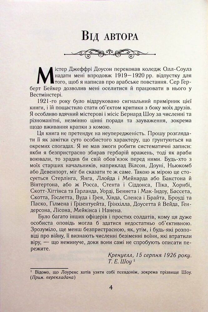 Томас Едвард Лоуренс, більш відомий як Лоуренс Аравійський, — знаменитий англійський розвідник, політик, письменник, перекладач. Його яскравий і незвичайний автобіографічний роман «Сім стовпів мудрості» — одна з найпопулярніших і найтиражніших книг у світі (за його мотивами знято легендарний фільм «Лоуренс Аравійський», один із шедеврів світового кінематографа). У цій книзі химерно поєднуються середньовічний екзотичний світ арабів, які вшановували Лоуренса майже як Месію, і реалії західного світу, що безцеремонно вторгся на початку минулого століття на Близький Схід. Але найголовніше в ній — душа Аравії, яку Лоуренс відчув і описав так, як це не вдавалося жодному з європейців.