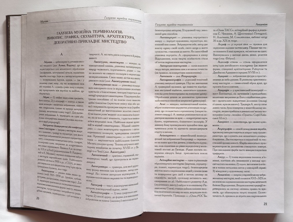 Словник-довідник включає загальновживану музейну лексику і поширені терміни, що стосуються архітектури, скульптури, живопису, графіки, декоративно-прикладних видів мистецтва, нумізматики, фалеристики, книгознавства, письмових джерел, реставраційної справи.