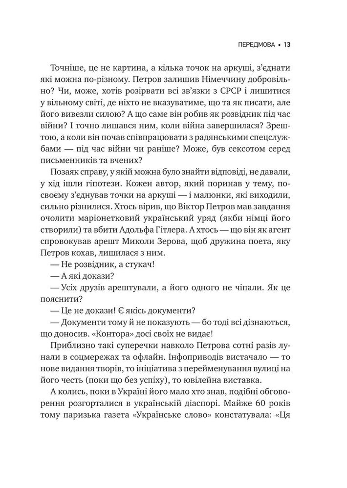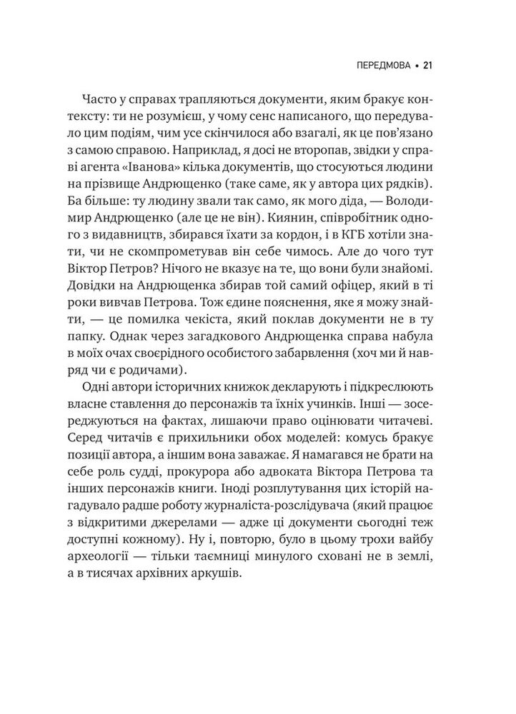 Автор поступово занурює в історію радянського спецагента, окреслюючи його діяння під час еміграції, Другої світової війни та Великого терору. Науковець показує, які зв'язки Петров мав з українською діаспорою та радянським підпіллям, як на ньому позначилися політичні репресії, а також які завдання він виконував під прикриттям.