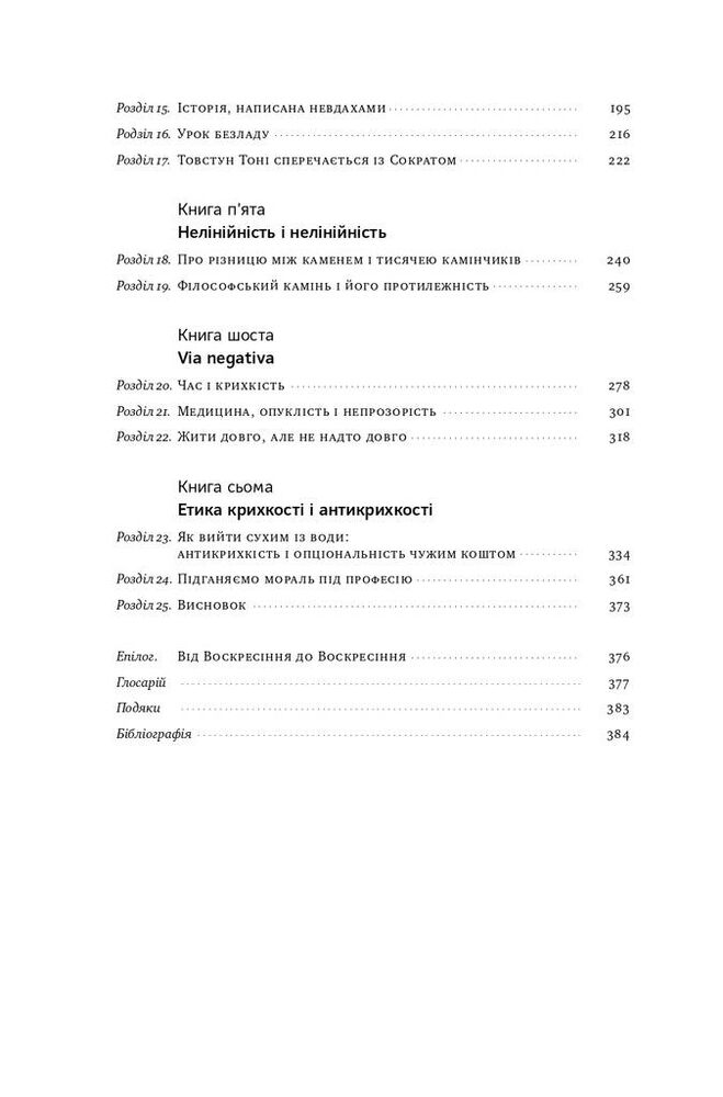 Наше життя неможливе без хаосу, мінливості та стресу, які постійно тиснуть на нас. В умовах невизначеності ми прагнемо сталості, однак саме вона стає перешкодою на шляху до розвитку. Дивовижно, та завдяки невизначеності і впливу змін люди, речі та цілі системи можуть еволюціонувати й ставати кращими. Цю рису Насім Талеб називає антикрихкістю й окреслює прості правила, які допоможуть обернути непередбачуваність і невизначеність на джерело самовдосконалення. Ба більше, ця властивість дає користь як людям, так і компаніям і навіть країнам, а коло питань, які допомагає з’ясувати книжка, надзвичайно широке — від методу помилок, оцінювання ризику до політики, освіти й медицини.