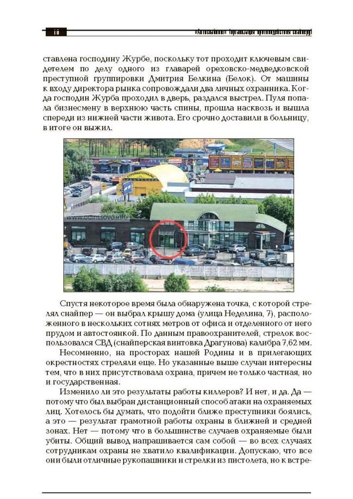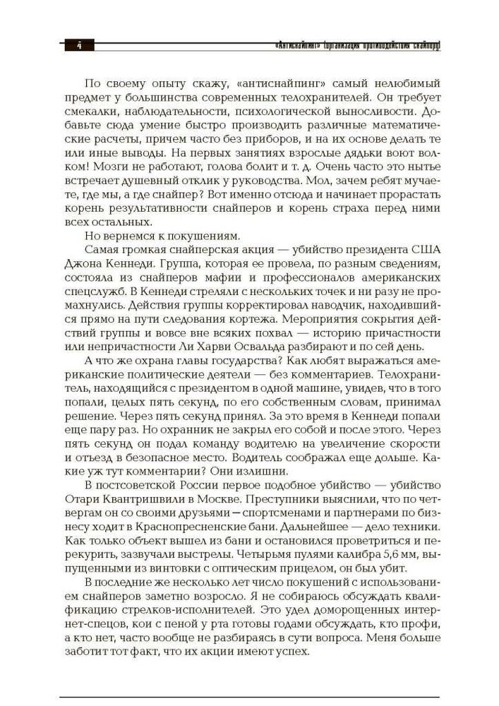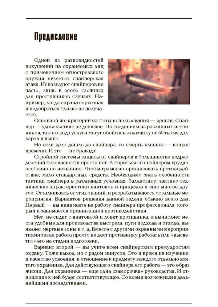 Цей навчально-практичний посібник присвячений одному з напрямків забезпечення безпеки - протидії нападам з використанням снайперів. Воно являє собою збори опорних конспектів за темами: особливості тактики кілерів-снайперів, зброю та спорядження снайпера, особливості маскування у місті та лісовій місцевості, організація протидії снайперу підрозділами охорони та ін.