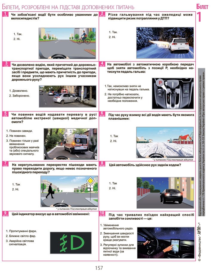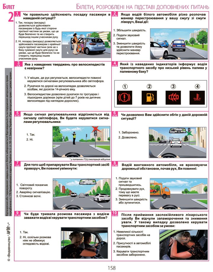 У книзі у вигляді білетів подано екзаменаційні питання, затверджені наказом Головного сервісного центру МВС України № 3 від 10.01.2024 р. «Про затвердження Змін до тестових питань до екзаменаційних білетів для складання теоретичного іспиту для отримання права на керування транспортними засобами відповідної категорії». У ній зібрано питання, що стосуються кандидатів у водії транспортних засобів категорій «А1» (мопеди, скутери), «А» (мотоцикли), «В» (легкові автомобілі), «ВЕ» (легкові автомобілі з причепом). Для категорій «А1» та «А» окремо сформовано 10 білетів по 10 запитань.