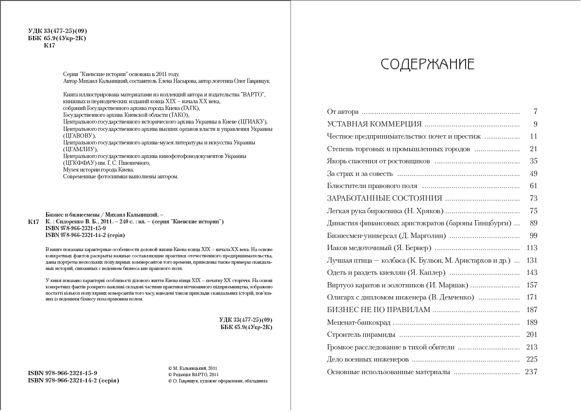 У книзі показано характерні особливості ділового життя Києва кінця ХІХ – початку ХХ сторіччя. На основі конкретних фактів розкрито важливі складові частини практики вітчизняного підприємництва, зображено кількох популярних комерсантів того часу, наведені також приклади скандальних історій, пов’язаних із веденням бізнесу поза правовим полем.