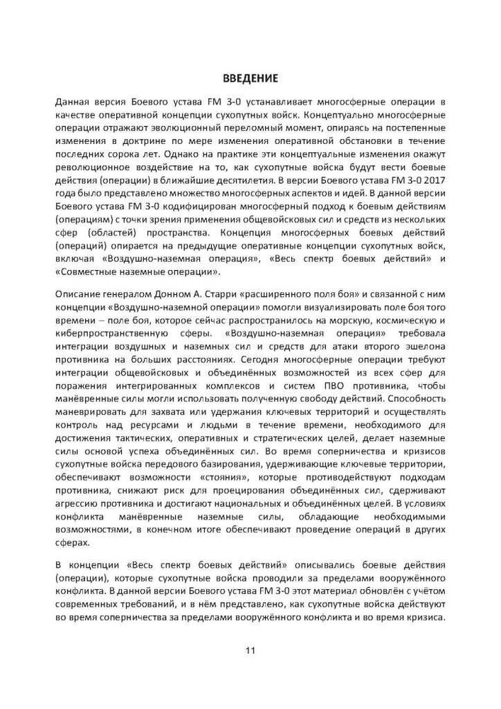 Бойовий статут FM 3-0, як і раніше, ґрунтується на принципах ведення війни і зміцнює наступальне мислення. У ньому представлено просте визначення багатосферних операцій, яке можна застосувати на всіх рівнях.