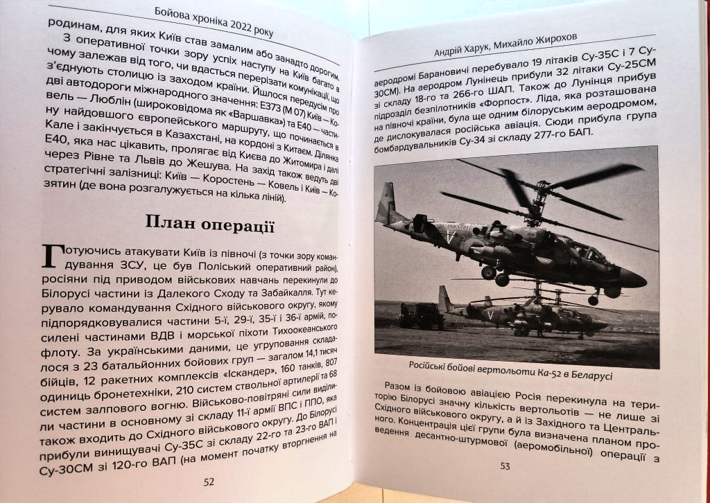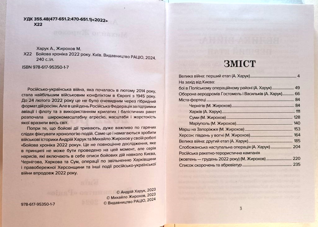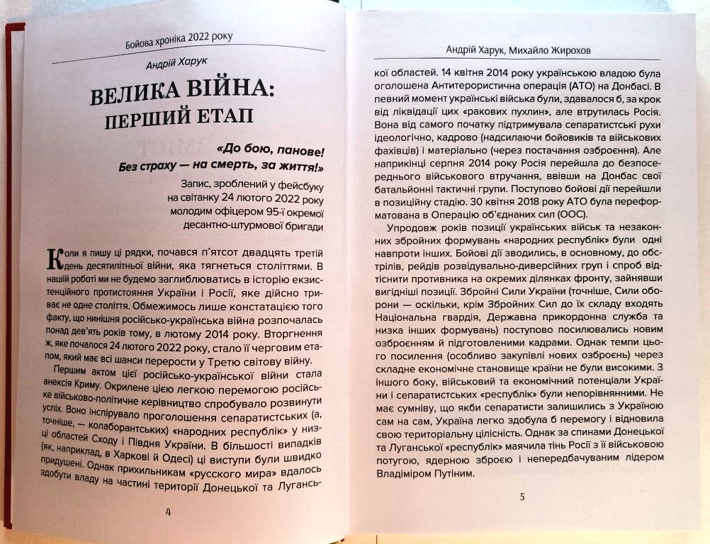 Попри те, що бойові дії тривають, дуже важливо по гарячих слідах фіксувати хронологію подій. Саме це і намагаються зробити військові історики Андрій Харук та Михайло Жирохов у своїй роботі «Бойова хроніка 2022 року». Це не повноцінне дослідження, яке в принципі не може бути проведено на цей момент, але серія нарисів, які включають в себе описи бойових дій навколо Києва, Чернігова, Харкова та Сум, операції по звільненню Харківщини і правобережної Херсонщини та інші події російсько-української війни впродовж 2022 року.