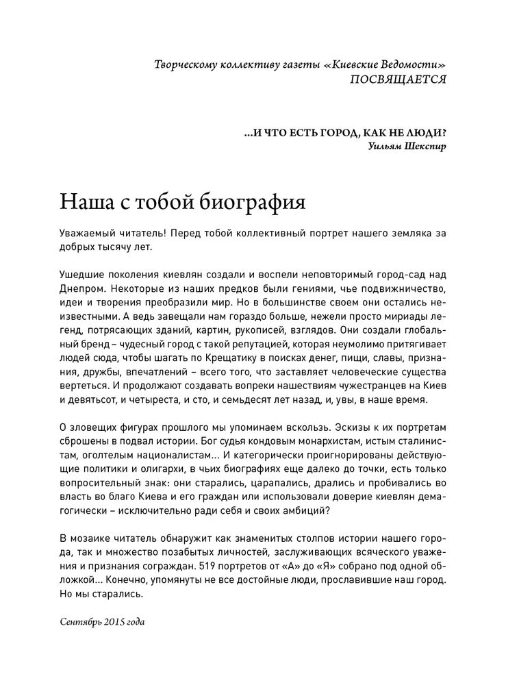 Історичний бестселер, написаний киянами про киян та для киян. У цій книзі читач виявить як знаменитих стовпів історії нашого міста, так і безліч забутих особистостей, які заслуговують на повагу і визнання співгромадян. Для широкого загалу читачів.