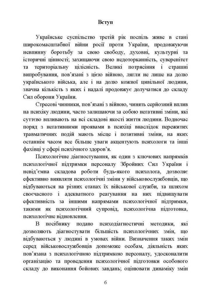 У методичному посібнику подано психодіагностичні методики, які дозволяють діагностувати більшість психологічних змін, що можуть спостерігатися у військовослужбовців в умовах війни. Переважна більшість методик мають експрес-характер. Їх застосування дозволяє проводити психологічне діагностування в умовах дефіциту часу, як при індивідуальній, так і при груповій формі роботи.