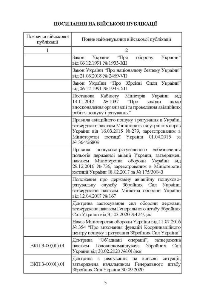 У доктрині враховані вимоги керівництва держави та Збройних Сил України щодо співробітництва у сфері оборони для приєднання до загальноєвропейської системи безпеки, досягнення взаємосумісності з країнами-членами НАТО та операції Об’єднаних сил на території Донецької та Луганської областей, принципи та процедури національної системи авіаційного пошуку та рятування, Міжнародних конвенцій ІКАО та Міжнародної морської організації і доктрин (стандартів) НАТО.