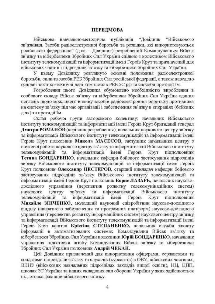 Розроблення цього довідника обумовлено необхідністю вироблення в особового складу Військ зв’язку та кібербезпеки Збройних Сил України єдиних поглядів щодо можливого впливу засобів радіоелектронної боротьби противника на систему зв’язку під час організації і забезпечення зв’язку в операціях (бойових діях) та протидії їм.