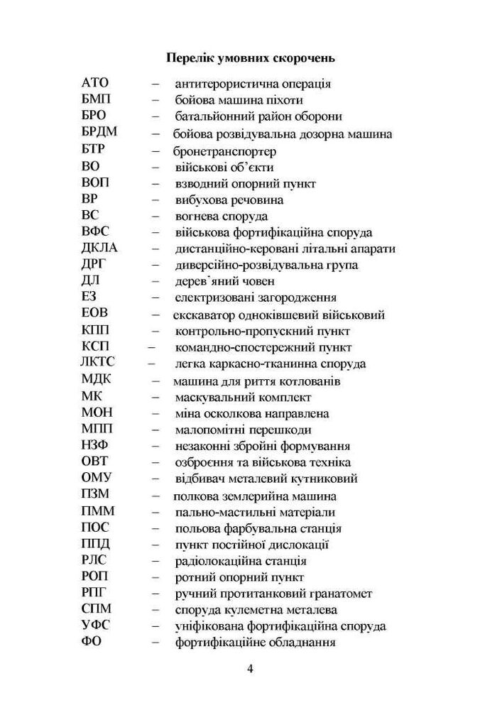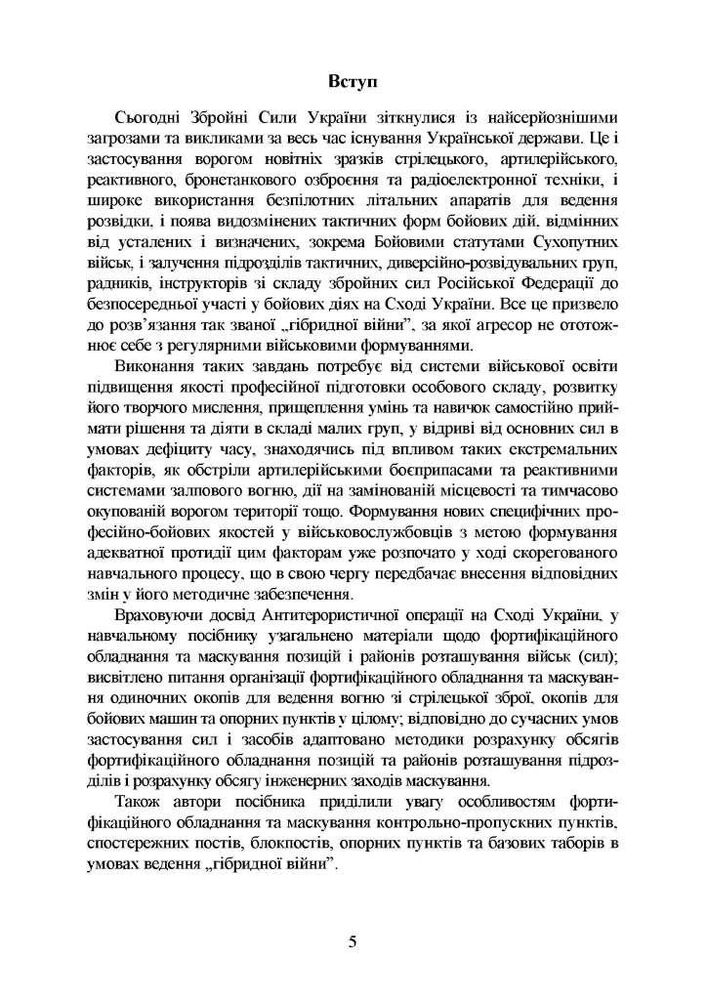 У навчальному посібнику, з урахуванням досвіду Антитерористичної операції на Сході України, узагальнено матеріали щодо фортифікаційного обладнання та