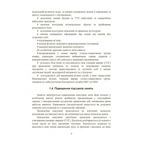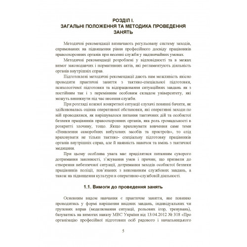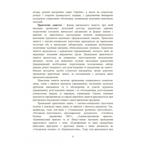 У методичних рекомендаціях висвітлені сучасні методи і психологічні особливості забезпечення та організації практичних занять з тактико спеціальної підготовки. Узагальнені та систематизовані алгоритми правильних дій працівників правоохоронних органів, їх ефективність та дієвість при виконанні повноважень покладених на них під час несення служби.