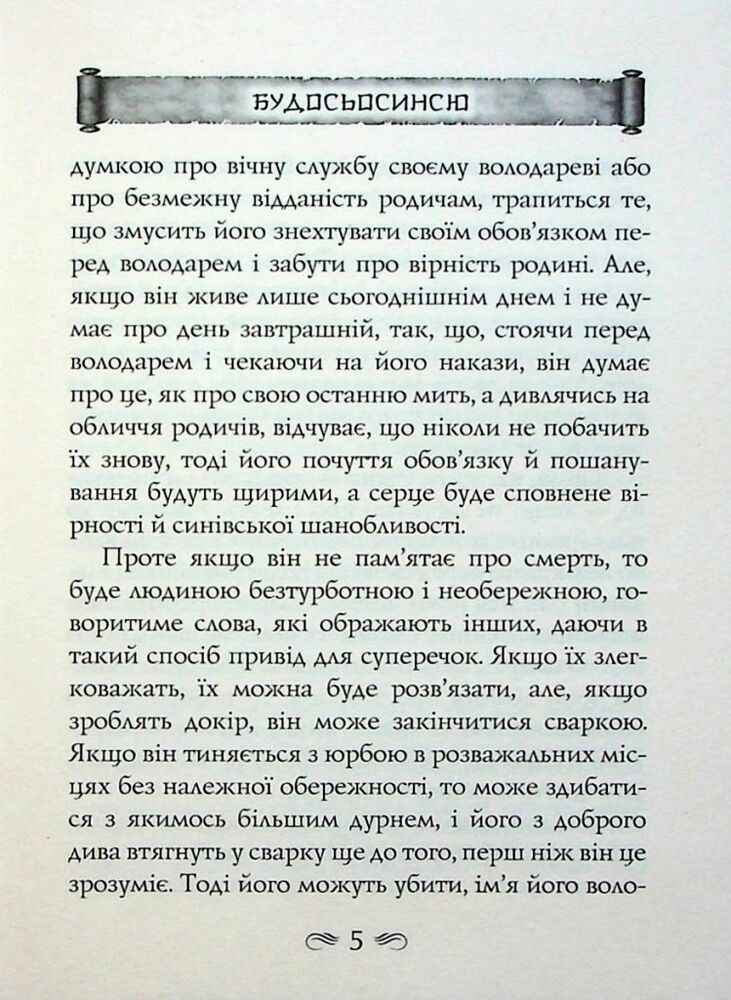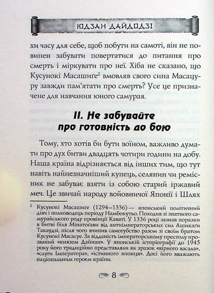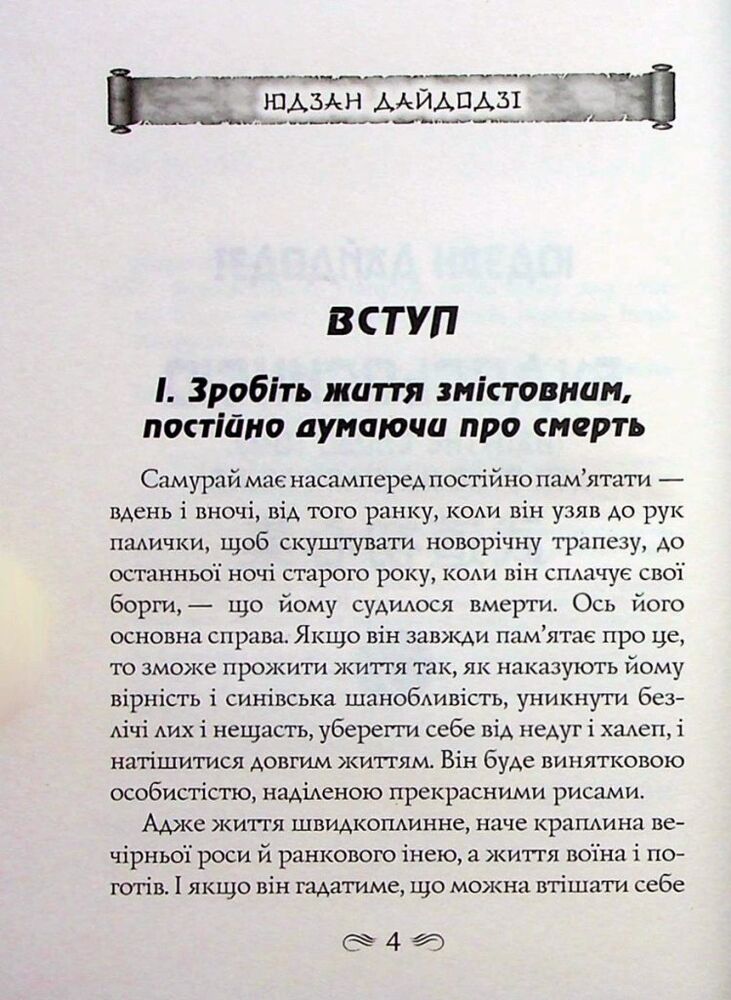 До цієї книги ввійшли філософські трактати двох великих мислителів, присвячених бусидо — Шляху воїна. Так у стародавній Японії називали зведення правил і настанов, що визначали поведінку та повсякденне життя самураїв. Класичне розуміння цього морального кодексу честі викладено в повчаннях «Будосьосинсю» («Напутнє слово тому, хто стає на Шлях воїна») спадкового самурая та державного діяча Юдзана Дайдодзі (1639–1730).