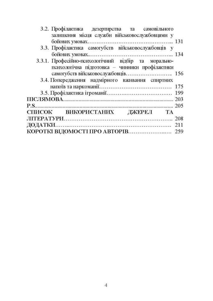 Автори розглядають загальні закономірності механізмів виникнення, профілактики та корекції відхилень (девіацій) у поведінці військових, акумулюють сучасні підходи до розуміння психологічних особливостей відхильної поведінки військовослужбовців. У книзі обґрунтовані форми, методи та способи, які можуть застосовуватися командиром (начальником) для профілактики відхильної поведінки у військовослужбовців.