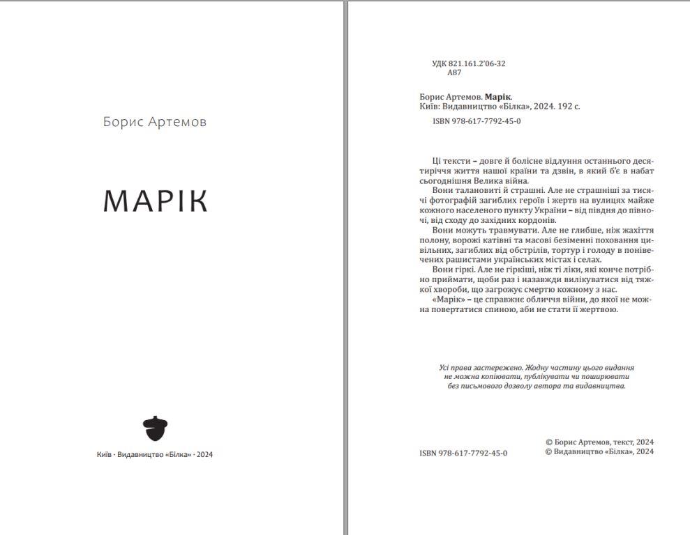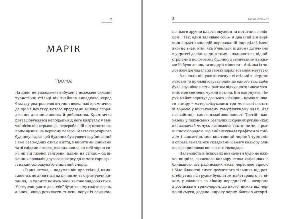 Якщо ви іще не читали книжку колишнього вчителя і журналіста із Запоріжжя Бориса Артемова "Марік", видану видавництвом "Білка" цьогоріч, маєте цю книжку прочитати. Вам дуже пощастить, якщо ви її прочитаєте. Звичайно, фіг цю книжку розрекламують усі ці глянцеві журнали та й електронні теж, однак досі нічого кращого про війну у нас написано і видано не було. Стиль -- суворий реалізм, навіть натуралізм, вражаючі деталі, іноді сентиментальні, пекучі до сліз. Мені найбільше припала до душі повість "Марік" й оповідання "Жіночий день". Загалом книжка про смерть і умирання, переважно про окуповані українські території, про помилкове переконання частини людства, зокрема росіян, наче вони не тріски, хоча насправді вони теж є ними, просто до них іще не дійшла сокира. Це також книжка про неймовірну силу літератури. Згаданий заблокований у підвалі Марік рятується тим, що пише щасливу історію про різдвяник. Скажу коротко: після цієї книжки хочеться жити. Вона дає надію. Дякую авторові за це .
