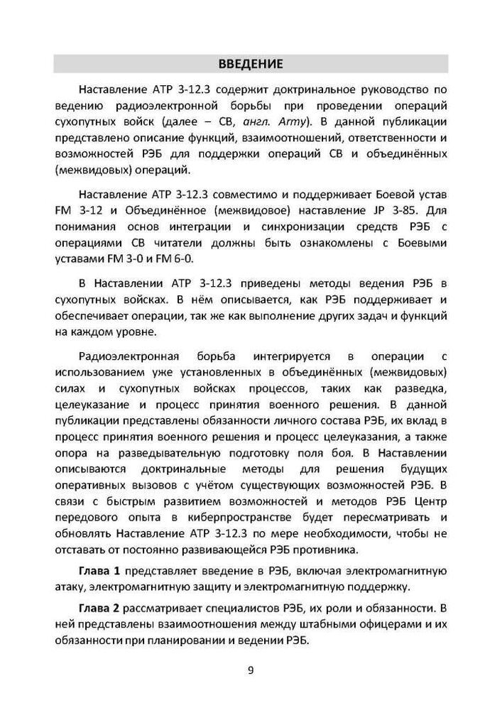 У Настанові АТР 3-12.3 наведено методи ведення РЕБ у сухопутних військах. У ньому описується, як РЕБ підтримує і забезпечує операції, так само як і виконання інших завдань і функцій на кожному рівні.