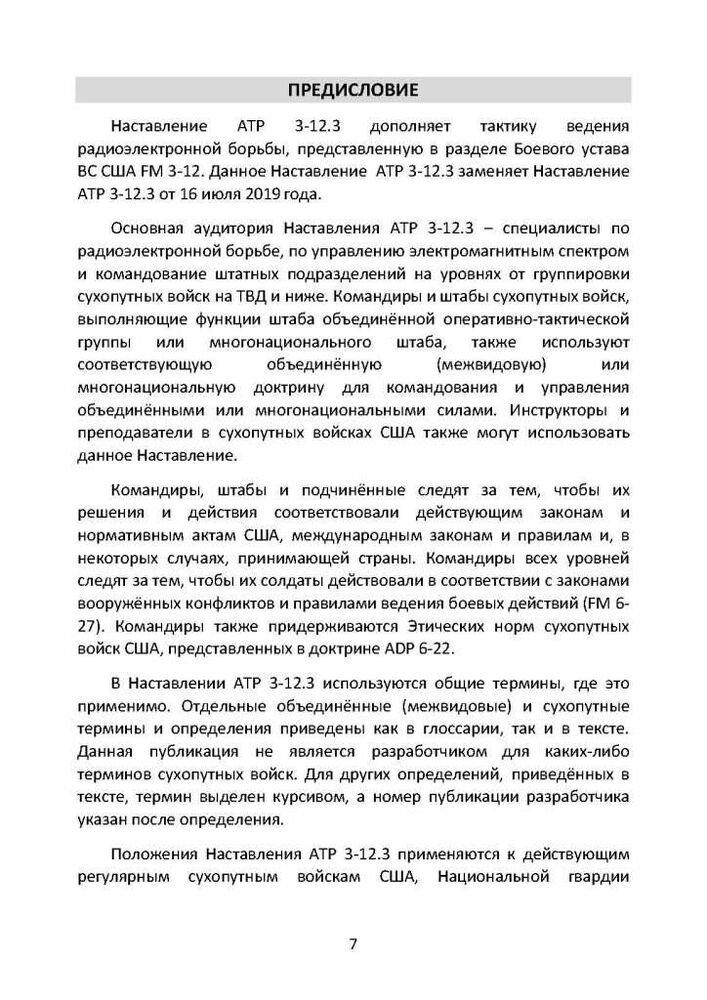 Основна аудиторія Настанови ATP 3-12.3 - фахівці з радіоелектронної боротьби, з управління електромагнітним спектром і командування штатних підрозділів на рівнях від угруповання сухопутних військ на ТВД і нижче. Командири і штаби сухопутних військ, які виконують функції штабу об'єднаної оперативно-тактичної групи або багатонаціонального штабу, також використовують відповідну об'єднану (міжвидову) або багатонаціональну доктрину для командування і управління об'єднаними або багатонаціональними силами.