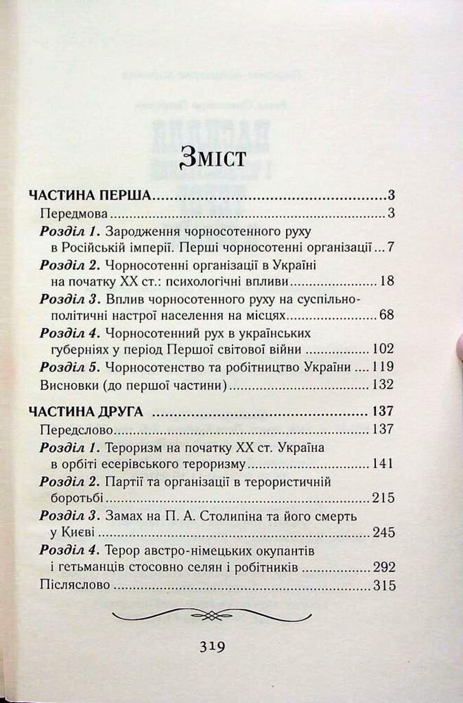 У першій частині книги досліджено історію зародження, становлення і функціонування чорносотенного руху на теренах України на тлі суспільно-політичної ситуації в тогочасній імперії на початку ХХ ст. загалом та в період Першої світової війни зокрема.