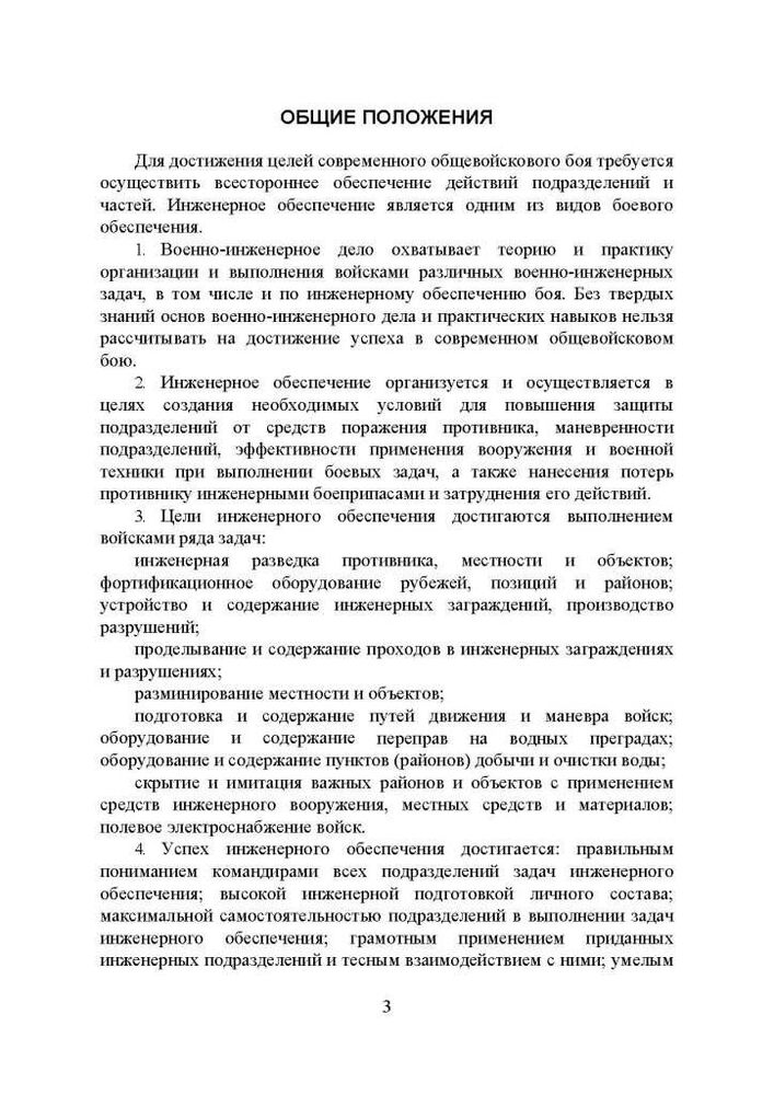 Настанова містить основні положення щодо організації та способів виконання основних завдань інженерного забезпечення бою та використання засобів інженерного озброєння підрозділами родів військ, спеціальних військ та тилу. Викладені у Настанові положення слід застосовувати, відповідно до конкретних умов обстановки.