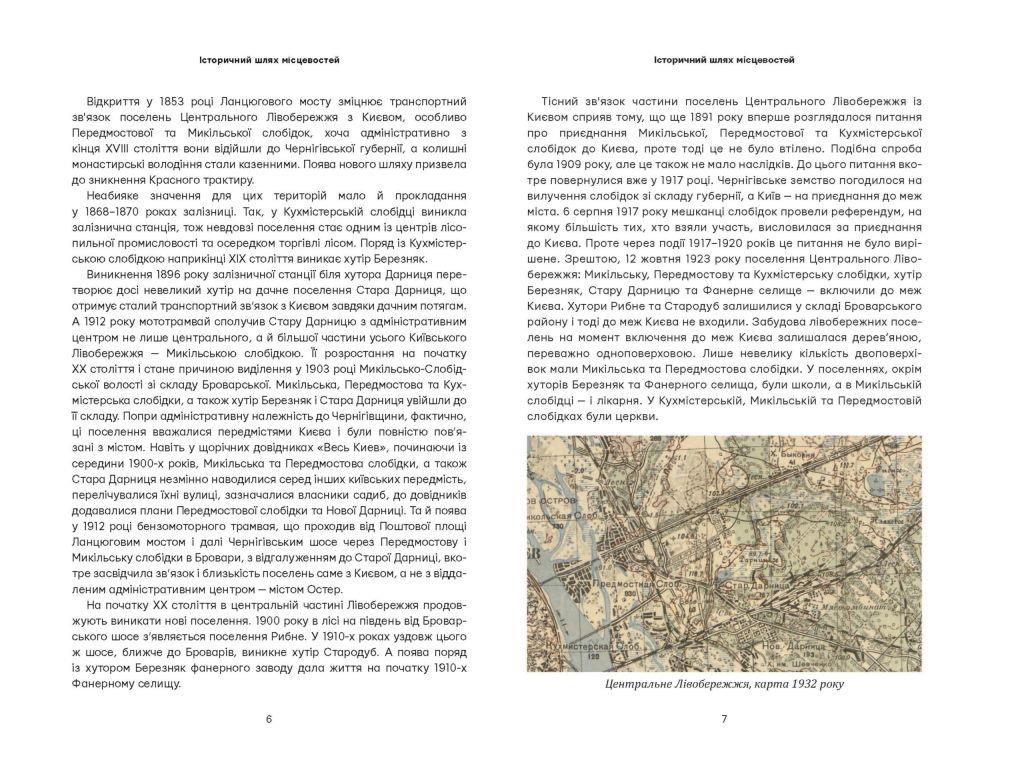 Книга про Центральне Лівобережжя охоплює простір між Броварським проспек¬том і залізницею, а також територію, обмежену дугою північної гілки залізниці. У роботі над книгою було використано історичні карти та космічні знімки, а також рідкісні архівні фотографії, багато з яких друкуються вперше. Особлива увага приділена процесу формування сучасної забудови, проаналізовані проєкти житлових районів та генеральні плани. У масовій забудові ідентифікована більшість типових проєктів житлових будинків та шкіл. Книга буде цікавою архітекторам, історикам, києвознавцям та києвофілам, лівобережним та правобережним мешканцям столиці, а також усім, хто цікавиться темою.