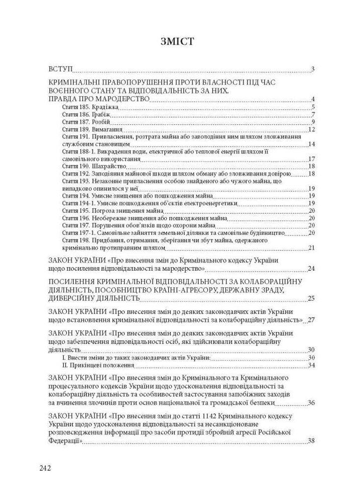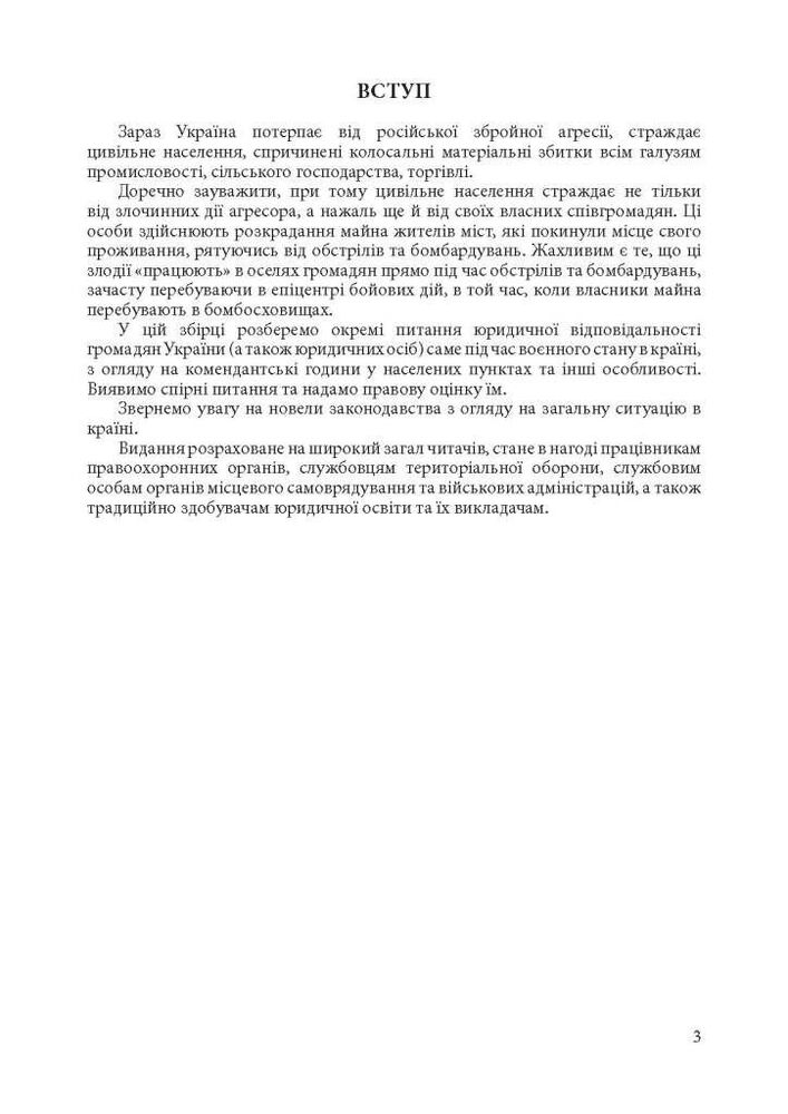 У виданні розглянуто окремі питання юридичної відповідальності громадян України (а також юридичних осіб) саме під час воєнного стану в країні, з огляду на комендантські години у населених пунктах та інші особливості, виявлено спірні питання та надано їм правову оцінку.