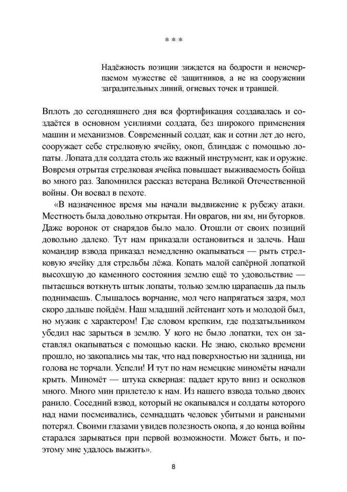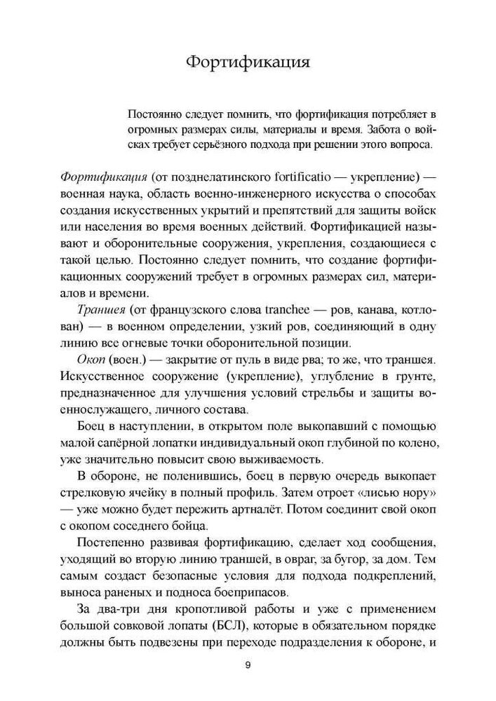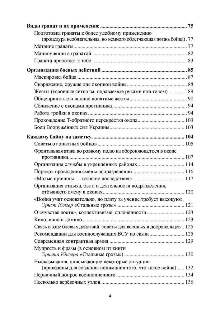 У навчально-методичному посібнику зібрані матеріали, написані в основному з досвіду Першої та Другої світових воєн. Видання доповнено матеріалами, які враховують сучасний досвід ведення бойових дій. Також читачеві пропонуються матеріали, що знайомлять із фортифікацією, зброєю та боєприпасами, тактикою штурму та оборони окопів.