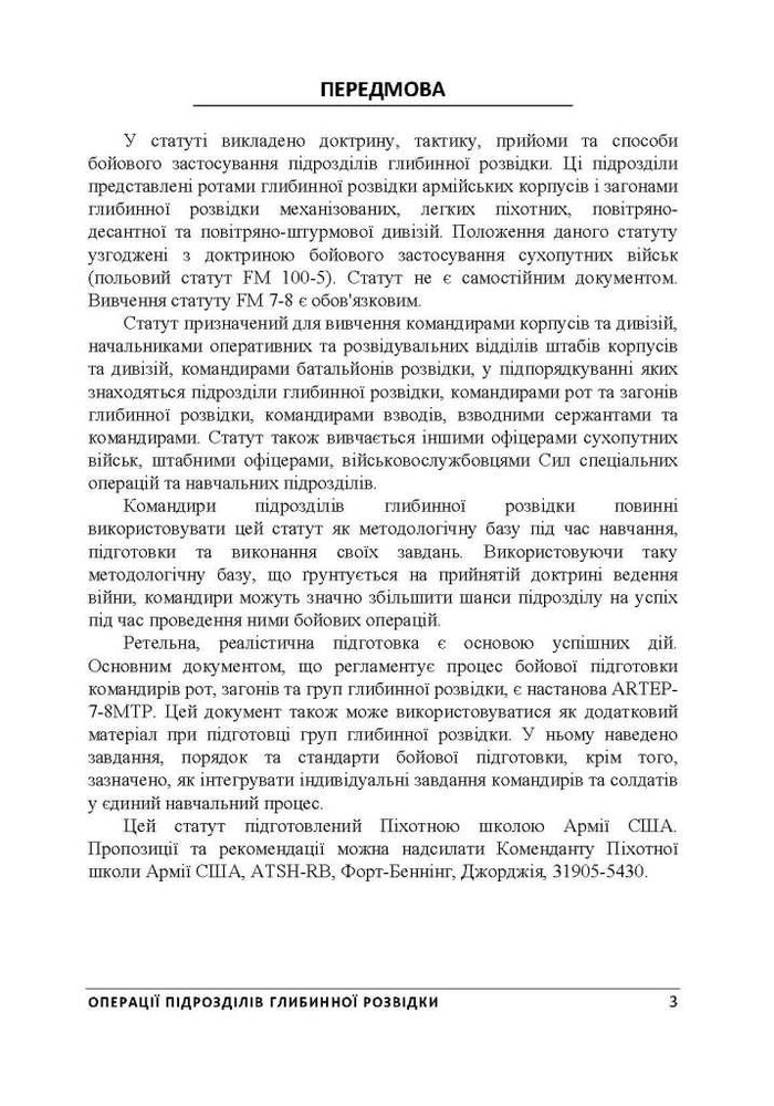 Викладено доктрину, тактику, прийоми та способи бойового застосування підрозділів глибинної розвідки. Ці підрозділи представлені ротами глибинної розвідки армійських корпусів та загонами глибинної розвідки механізованих, легких піхотних, повітряно-десантної та повітряно-штурмової дивізій. Положення цього статуту узгоджені з доктриною бойового застосування сухопутних військ (польовий статут FM 100-5).