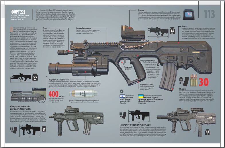 В книгу «Боевой арсенал 2013» также включен раздел, посвященный новому стрелковому оружию. Речь идет об автоматах, снайперских винтовках, пистолет-пулеметах, пистолетах, которые разрабатывается или серийно производятся украинскими компаниями – как для зарубежных заказчиков, так и для оснащения подразделений силовых структур Украины.