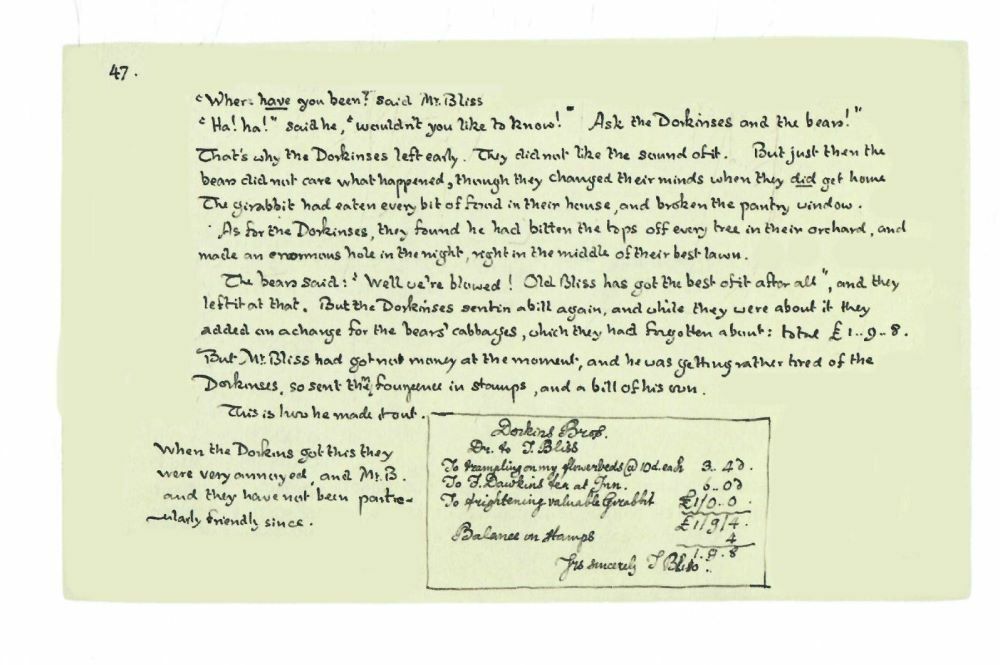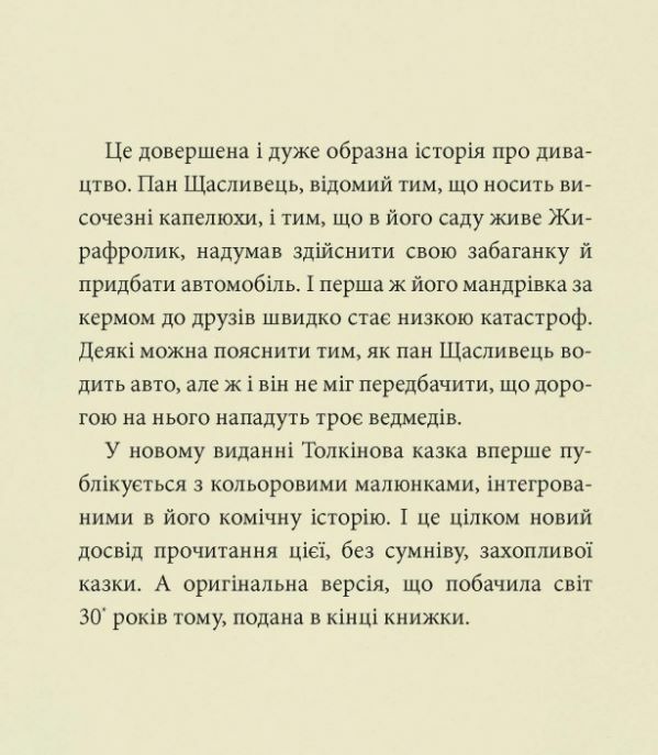 Пан Щасливець уперше сам за кермом вирушає на новому автомобілі до друзів Бевзників. І, звісно, від пригод не втекти. Там тачка капусти посеред дороги, там візок з бананами, а в лісі — ще й троє ведмедів. Але не всі пригоди скінчилися разом з мандрівкою. Що ж чекає на пана Щасливця дома і що то за натовп суне до нього? Про все це розповідає ілюстрована казочка Дж. Р. Р. Толкіна, яка зродилася з пригод самого автора на його першому автомобілі, придбаному 1932 року. Прототипами ведмедів стали іграшкові ведмедики Толкінових синів. А двом персонажам він дав імена двох героїв свого «Володаря Перснів». Та й ілюстрації до цієї книжечки виконав сам пан Толкін, прив’язуючи розповідь до малюнків, а часто мовби безпосередньо їх коментуючи.