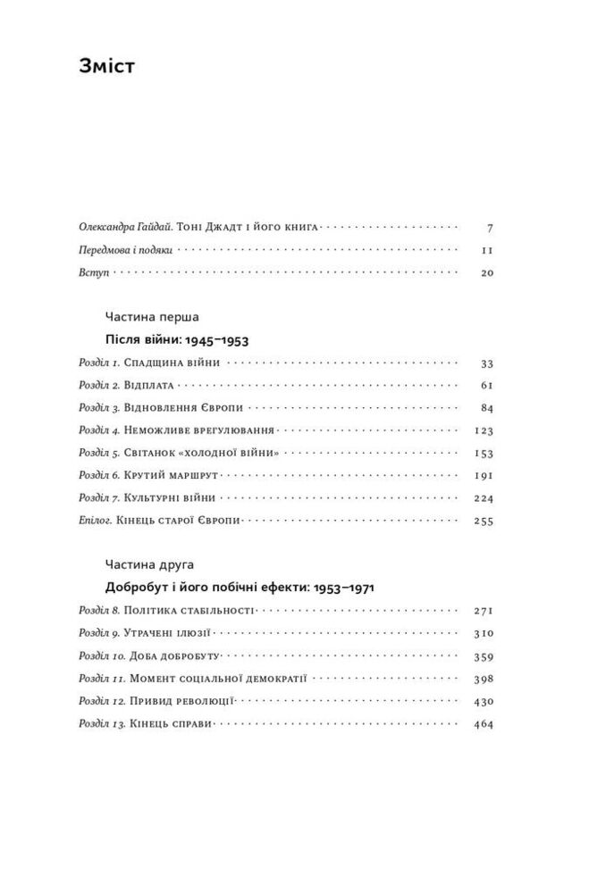 У ній Джадт прискіпливо розбирає, як Друга світова змінила континент — географічно, політично, інтелектуально й економічно. Він описує трансформації, що відбулися за 60 років миру, і як вони вплинули на становище різних країн. На відміну від інших дослідників, Джадт не зациклюється на Західній Європі, а присвячує увагу і Східній. Тому з видання ви довідаєтеся про минуле не лише «зіркових держав» — Німеччини, Британії чи Франції, — а й менш популярних.