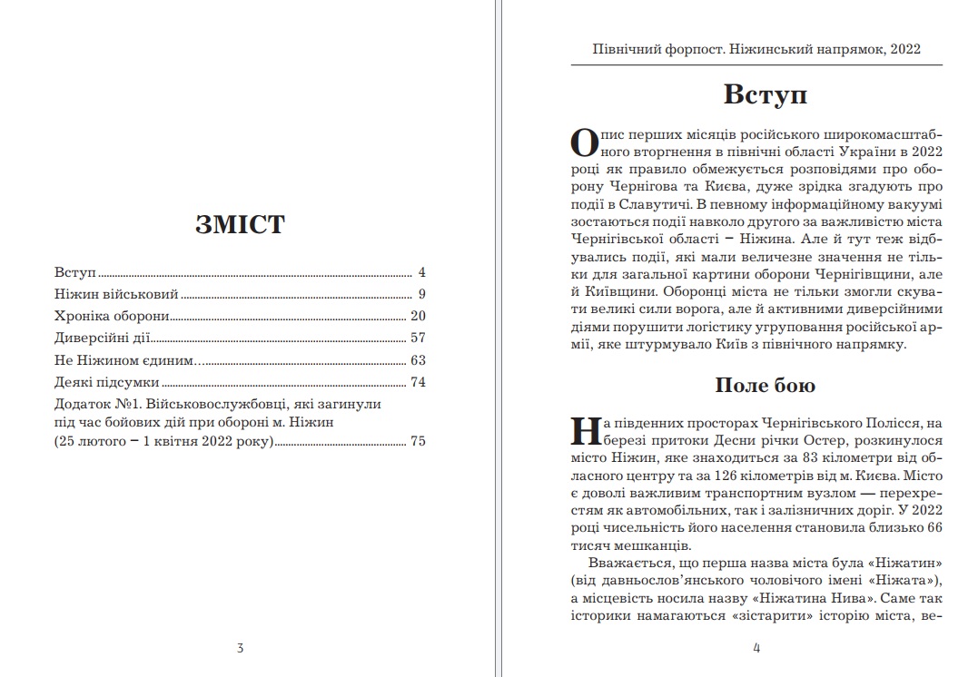 Oпис перших місяців російського широкомасштабного вторгнення в північні області України в 2022 році як правило обмежується розповідями про оборону Чернігова та Києва, дуже зрідка згадують про події в Славутичі. В певному інформаційному вакуумі зостаються події навколо другого за важливістю міста Чернігівської області - Ніжина. Але й тут теж відбувались події, які мали величезне значення не тільки для загальної картини оборони Чернігівщини, але й Київщини. Оборонці міста не тільки змогли скувати великі сили ворога, але й активними диверсійними діями порушити логістику угруповання російської армії, яке штурмувало Київ з північного напрямку.