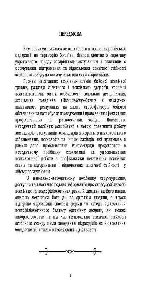 Навчально-методичний посібник поглиблює теоретичну та прикладну психологічну підготовку офіцерського та сержантського складу і містить практичні рекомендації, антистресові методи та прийоми, спрямовані на відновлення психічного здоров’я та розвиток стресостійкості військовослужбовця в умовах екстремальної (бойової) діяльності