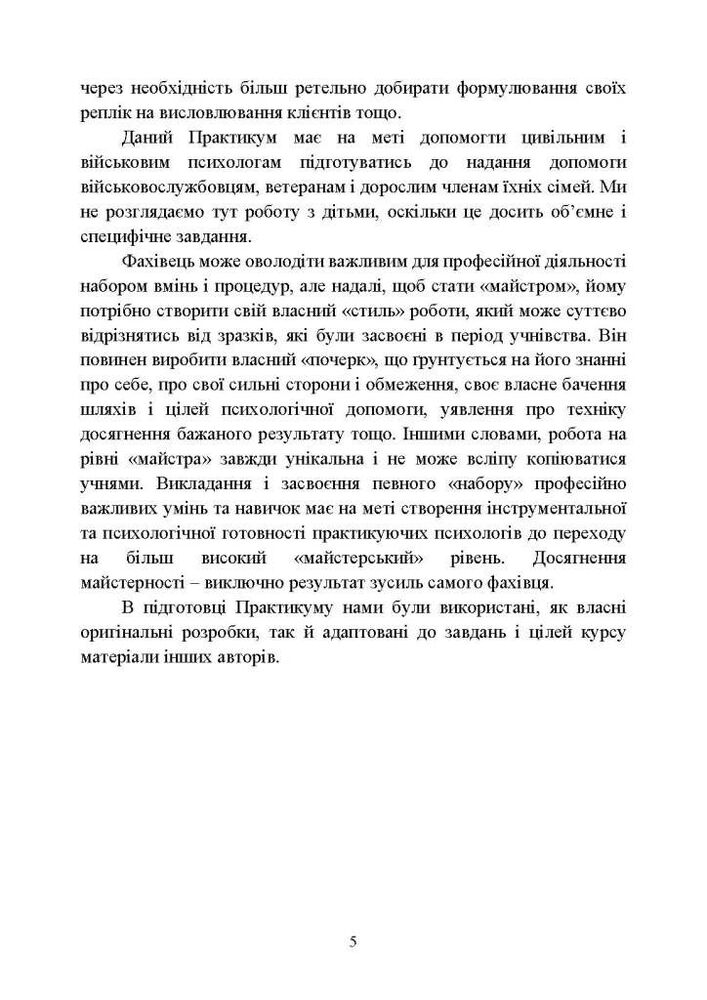 Практикум має на меті допомогти військовим і цивільним психологам вдосконалити базисні навички консультування клієнтів військовослужбовців, ветеранів та дорослих членів їхніх сімей, а також створити підґрунтя для їх повноцінного професійного зростання. Розділи Практикуму підпорядковані логіці побудови процесу підготовки фахівців-консультантів.