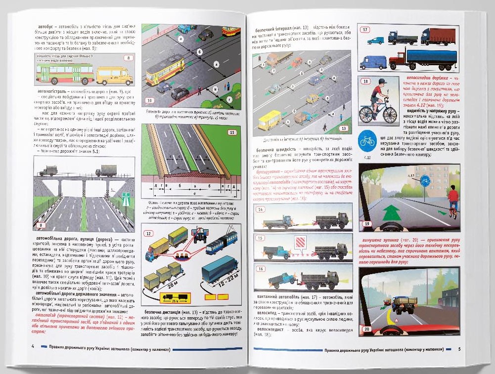 Видання містить понад 550 детальних ілюстрованих коментарів до чинних Правил дорожнього руху України, які допоможуть краще засвоїти матеріал і ефективно застосовувати його на практиці. Органічна єдність офіційного тексту ПДР і коментарів у малюнках полегшить вивчення Правил, що своєю чергою дасть змогу краще орієнтуватися в реальних дорожніх ситуаціях, швидко і правильно приймати рішення. Особливу вагу приділено складним для сприйняття темам («Дорожні знаки», «Дорожня розмітка», «Сигнали регулювальника» та ін.). У посібнику наведено штрафи і відповідальність за порушення ПДР з урахуванням останніх змін в Кодексі України про адміністративні правопорушення, а також алгоритм послідовності дій водія у разі ДТП.